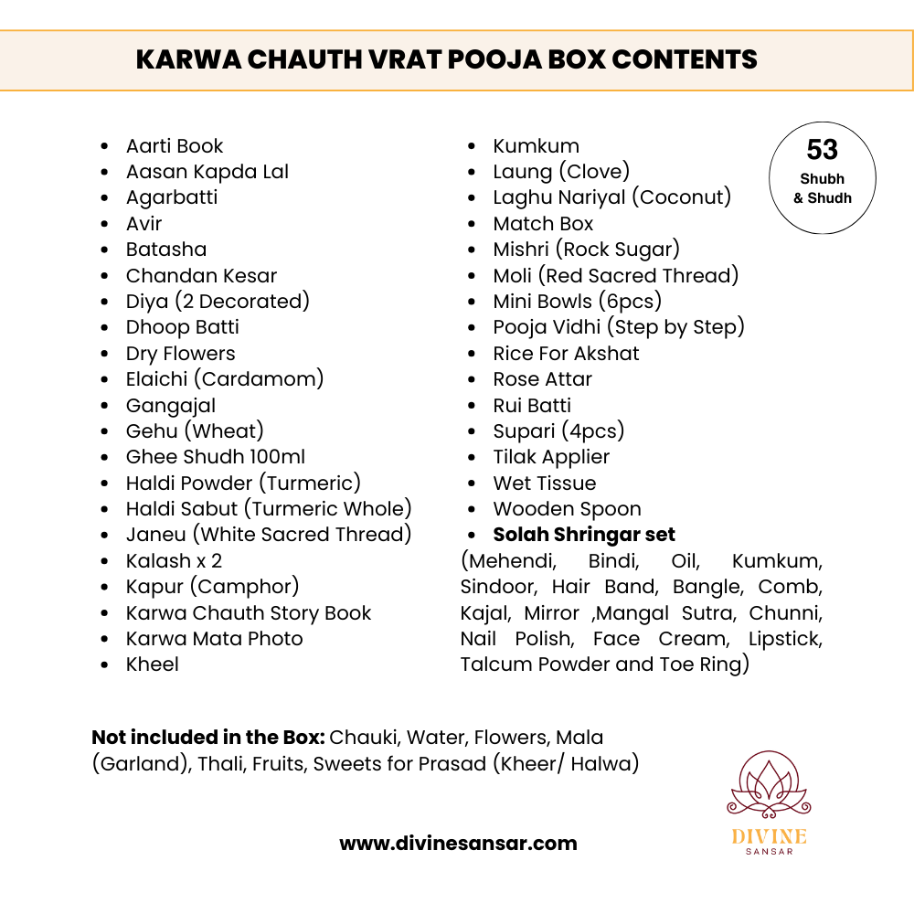 Celebrate the sacred bond of love and devotion with Divine Sansar’s Karwa Chauth Collection, thoughtfully curated for every married woman observing this auspicious vrat. From complete Karwa Chauth Pooja Boxes with 53 shubh & shudh samagri to Karwa Mata photo posters, Solah Shringar sets, pooja essentials, and decorative thalis, our collection brings together everything you need in one place.