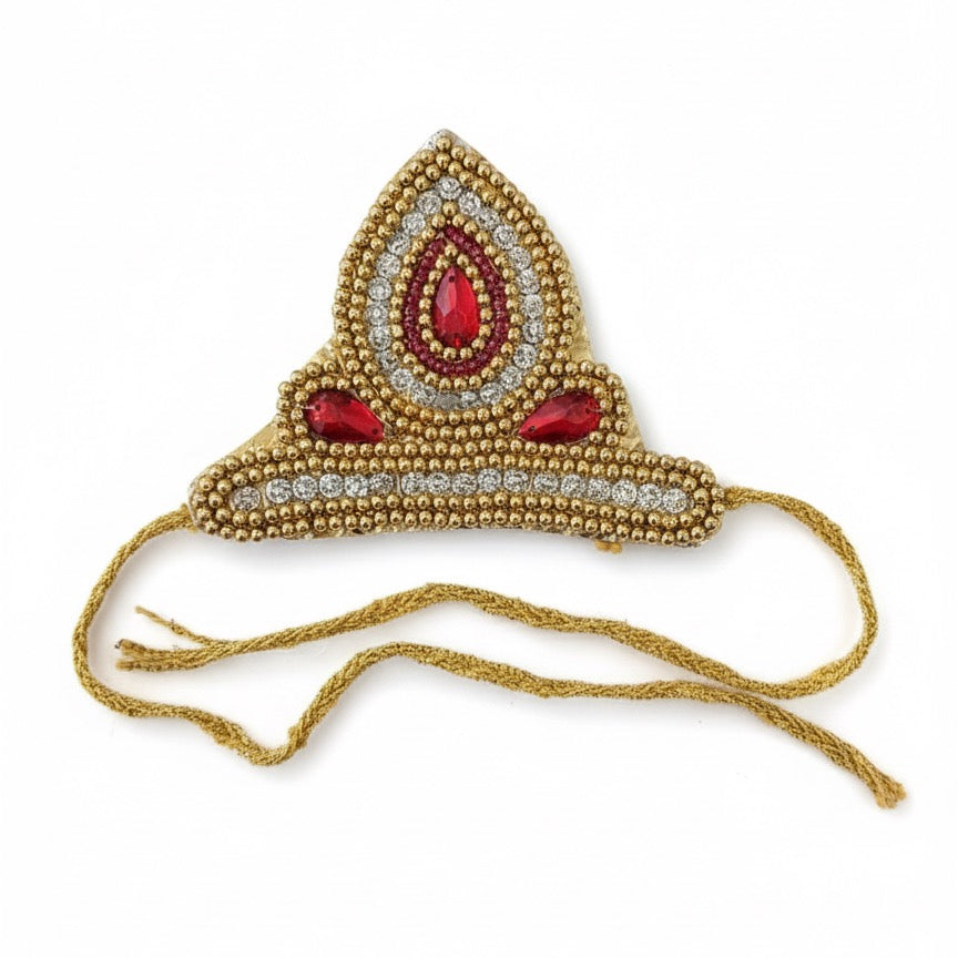 Handcrafted Gold-Beaded Mukut (Deity Crown) — Red Teardrop Gem, Adjustable Ties