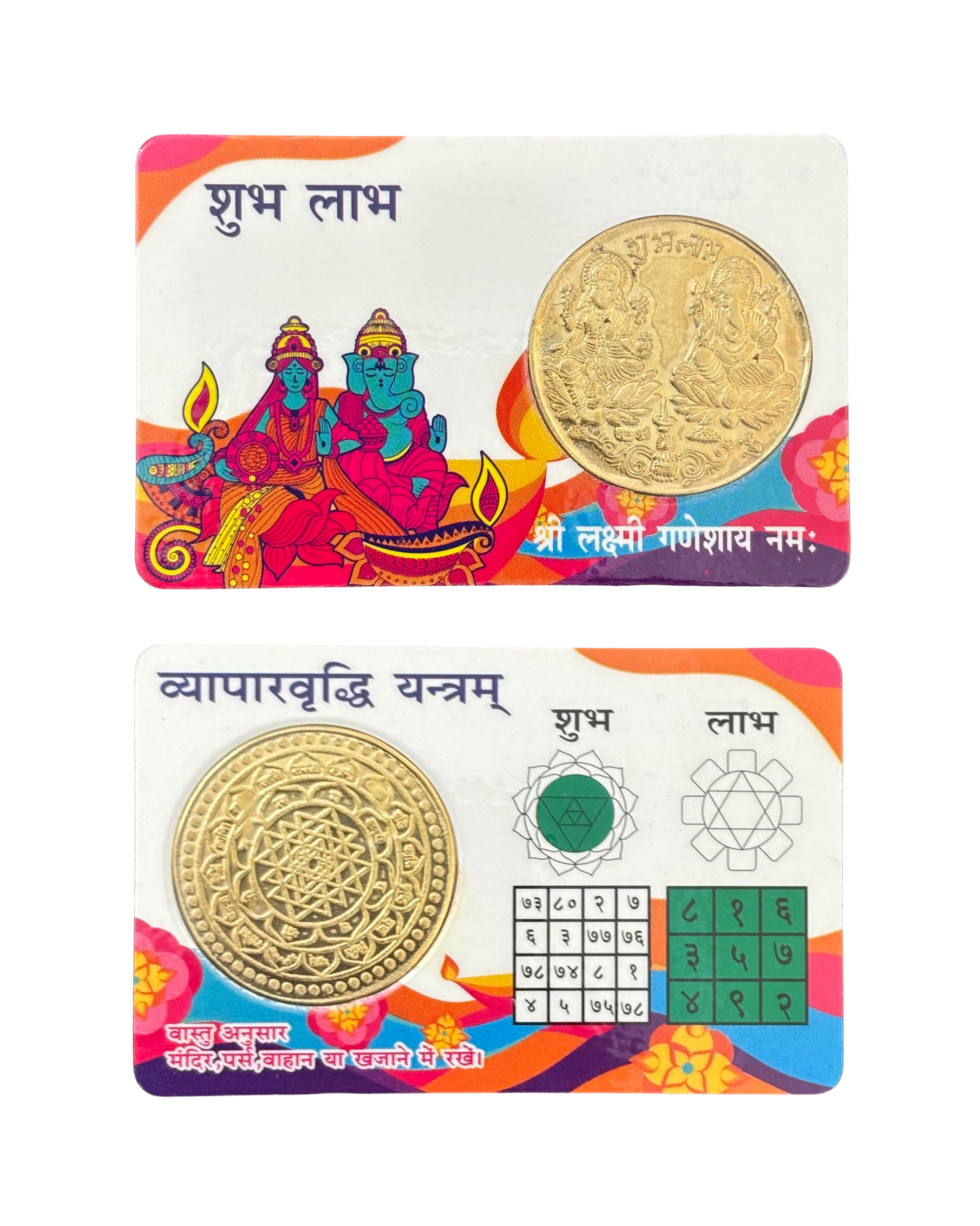 1 x Shubh Labh laminated coin card (Lakshmi–Ganesha & Vyapar Vriddhi Yantra)