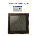 - Materials: genuine raw pyrite backdrop, glass front, wooden frame with gold-tone trim, protective backing.