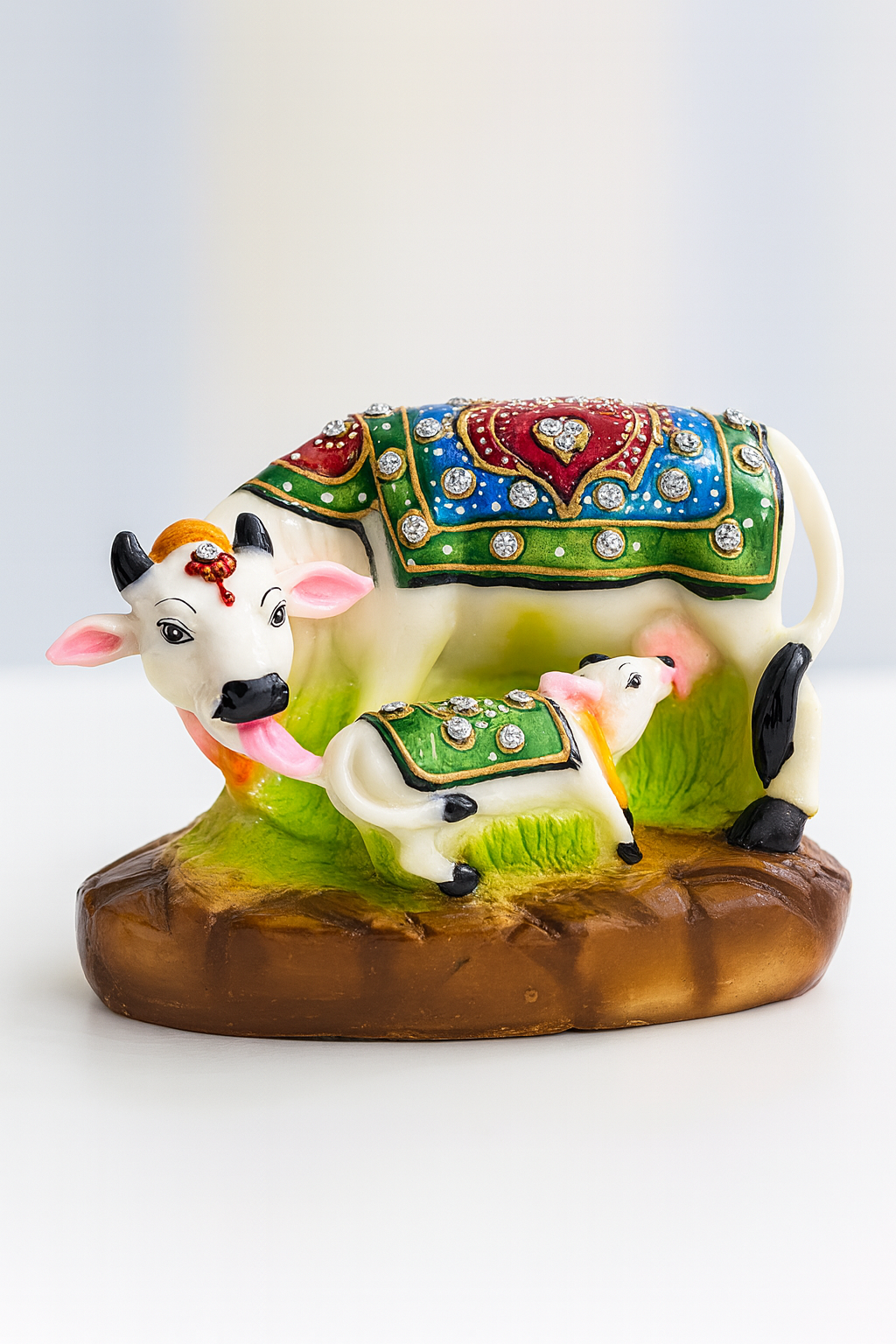 Enhance your home décor and spiritual space with this beautiful Kamdhenu Cow and Calf idol. Symbolizing prosperity, abundance, and motherly love, this hand-painted piece features exquisite detailing, vibrant colors, and embedded decorative stones for a regal look.