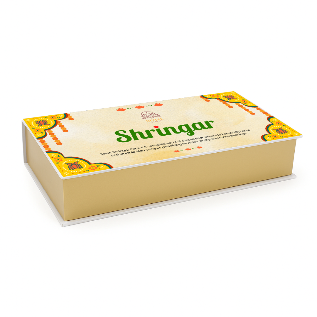The Devi Solah Shringar Box is a treasure trove of beauty and tradition. It includes a comb, oil, mehendi, kajal, bangles, sindoor, kumkum, hair band, bindi, mala, and chunni. These items are carefully selected to ensure they meet the highest standards of quality and authenticity, reflecting the rich cultural heritage of India.