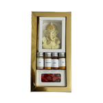 Celebrate new chapters with a little help from Ganesha. This elegant gift box — crafted for simplicity and style — brings together all the small sacred touches that make a home puja feel special: a lovingly finished Ganesha murti, fragrant dried flowers, classic puja powders, rice for akshat and a luxe red aasan cloth. Perfect as a thoughtful housewarming present, corporate gifting option, or a ready kit for your own home altar.