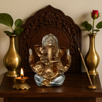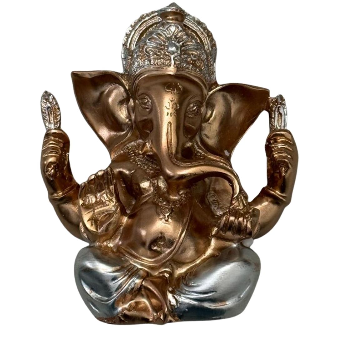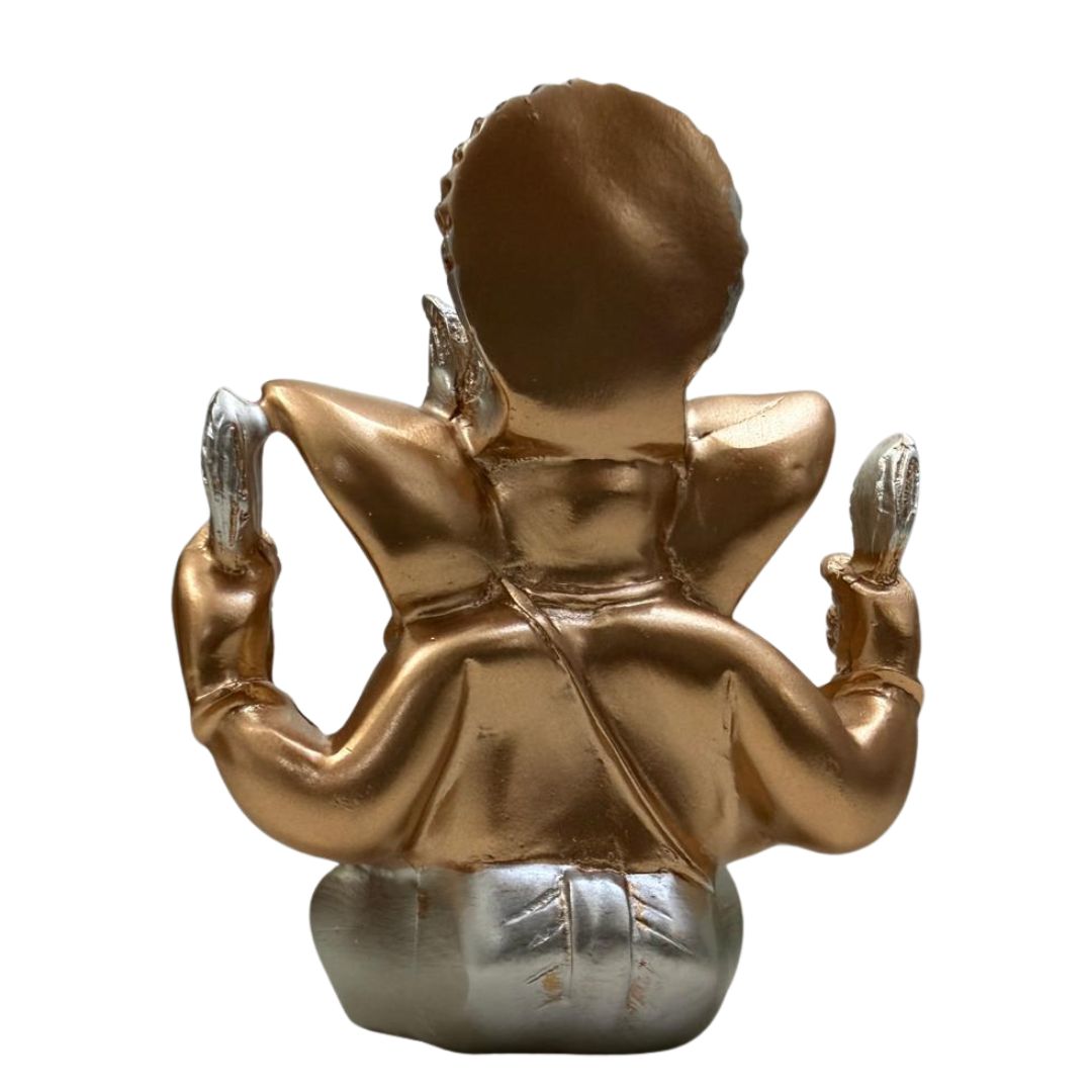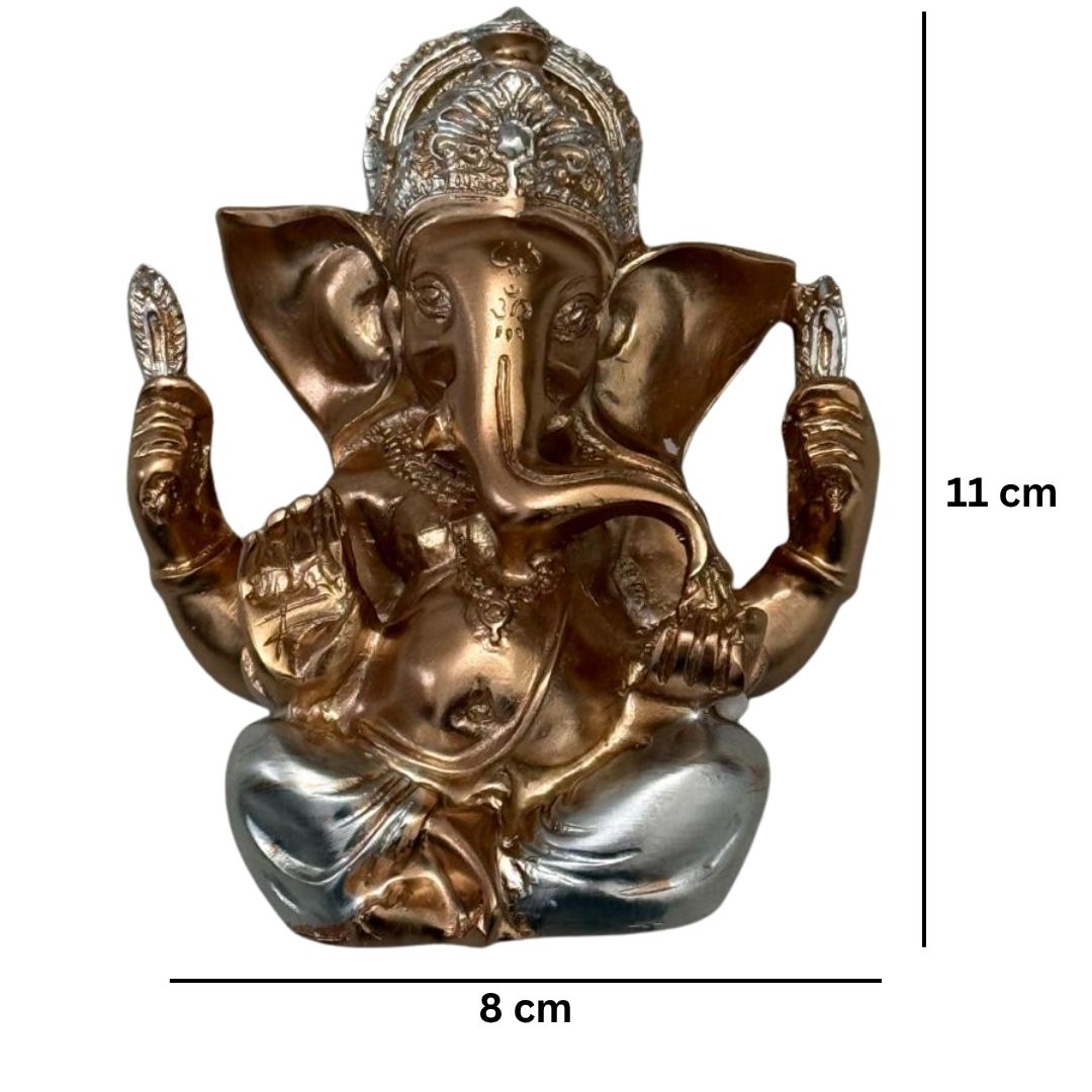 Compact golden Ganeshji murti (11×8 cm) — perfect for pooja rooms, office desks, and gifting. Hand-finished, detailed, and securely packaged.