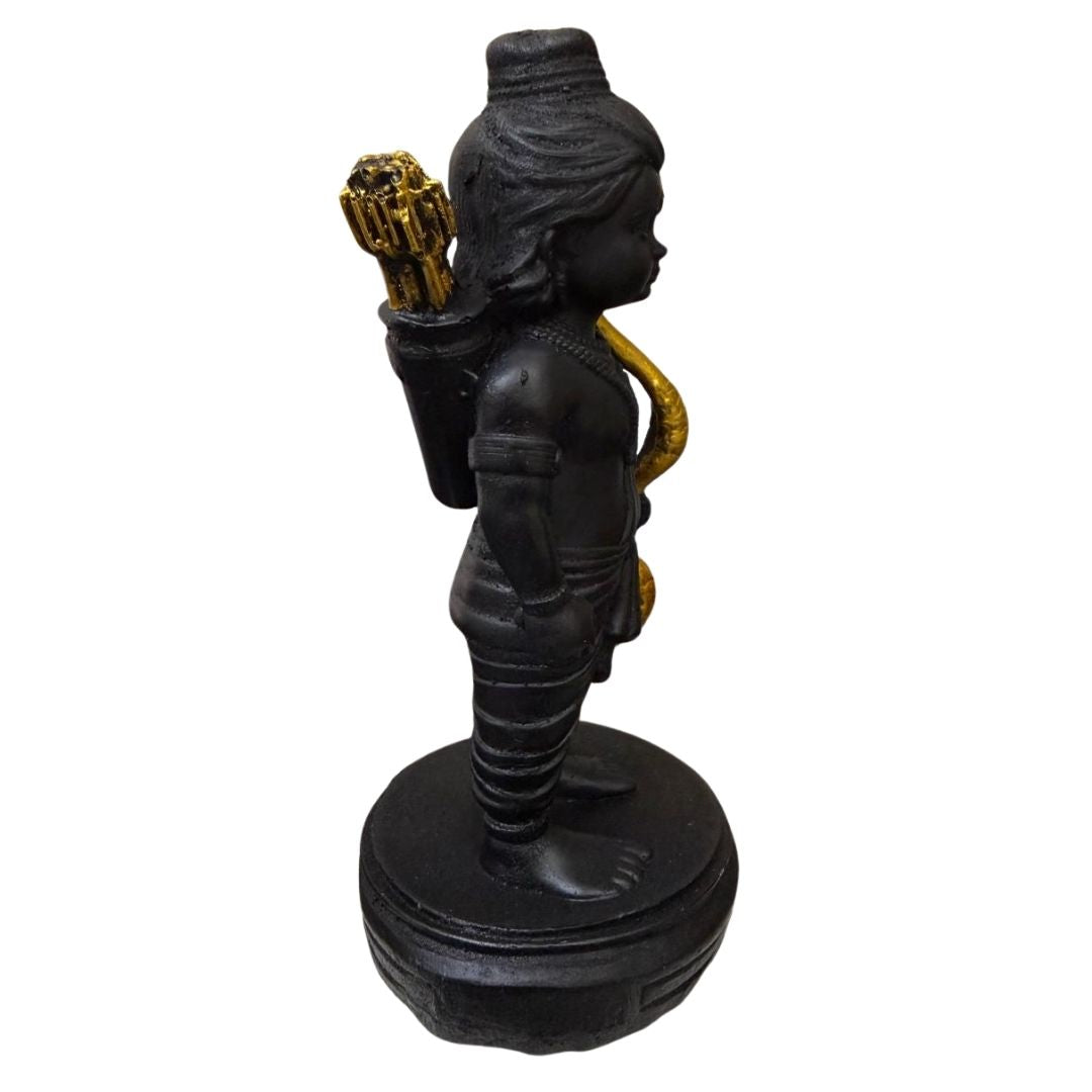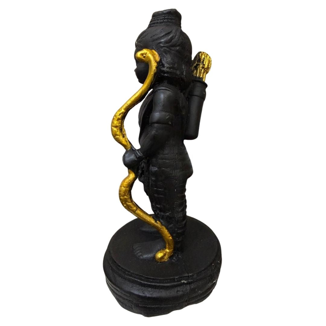 Standing Ram Lala statue — 16×8.5 cm. Matte black finish with gold-accented bow. Compact puja idol for home altars, car shrines, desks and gifting.
