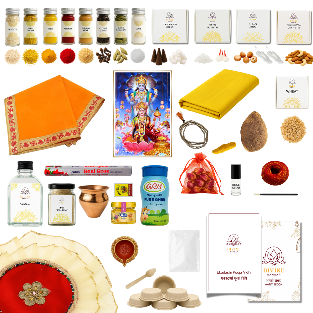 Complete Vishnu Vrat Kit: 39 essential, high-quality pooja samagris in one designer compartment box.