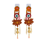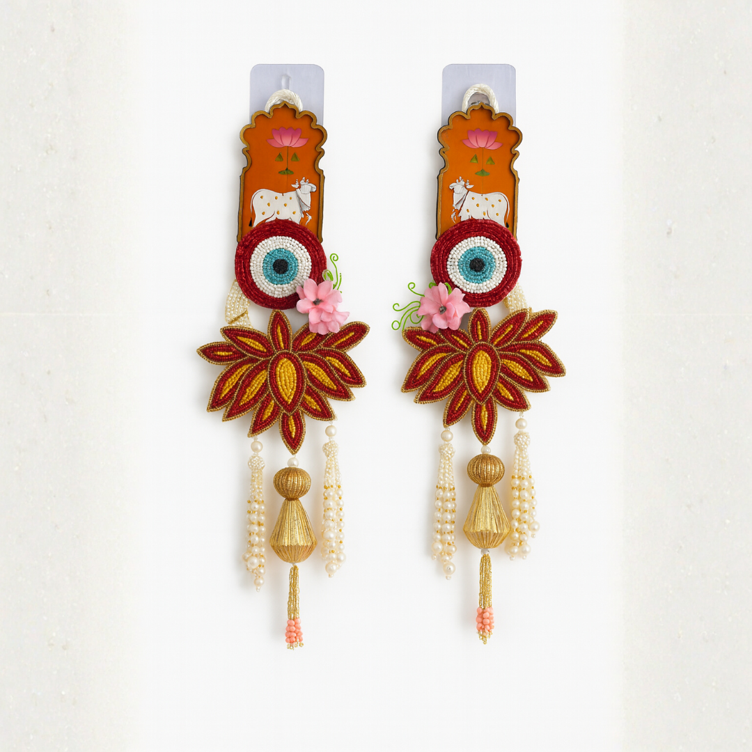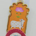 Featuring the sacred Kamdhenu cow painted on an orange backdrop with lotus motifs, each piece is richly embellished with beads, fabric flowers, and golden tassels.