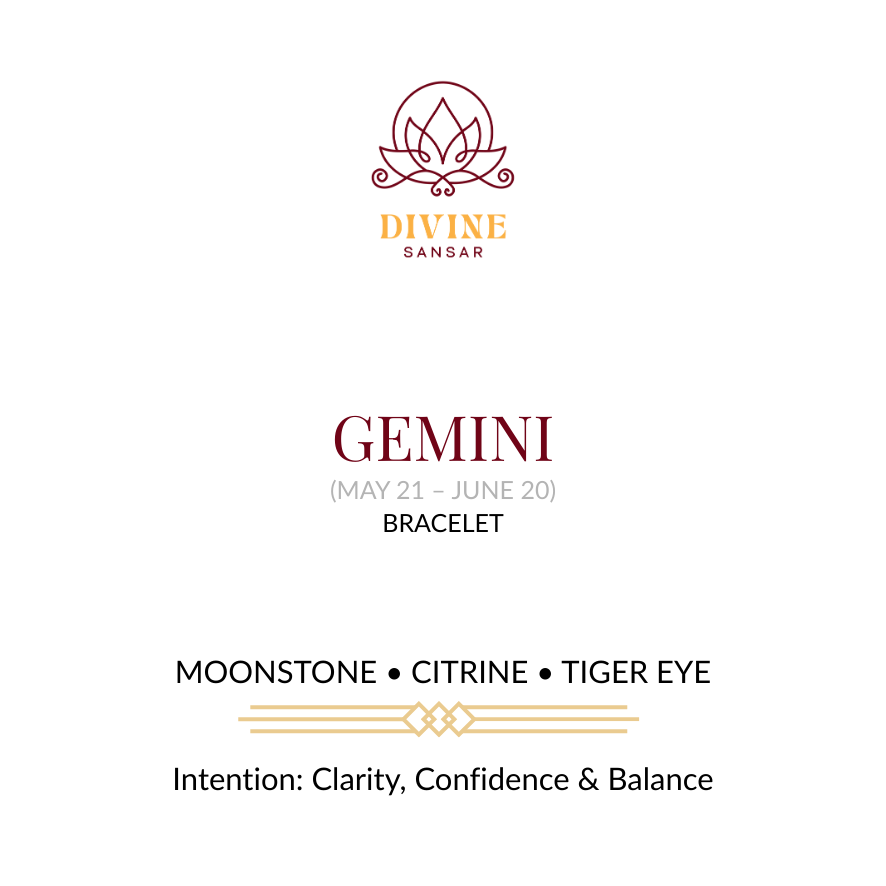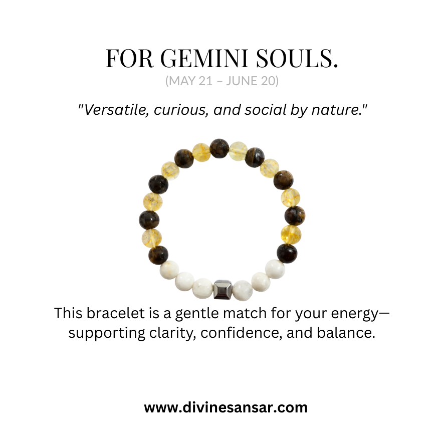 For Gemini souls—versatile, curious, and naturally social. This Gemini Crystal Bracelet is curated to support clarity and balance, with stones traditionally associated with intuition, joy, and focus.