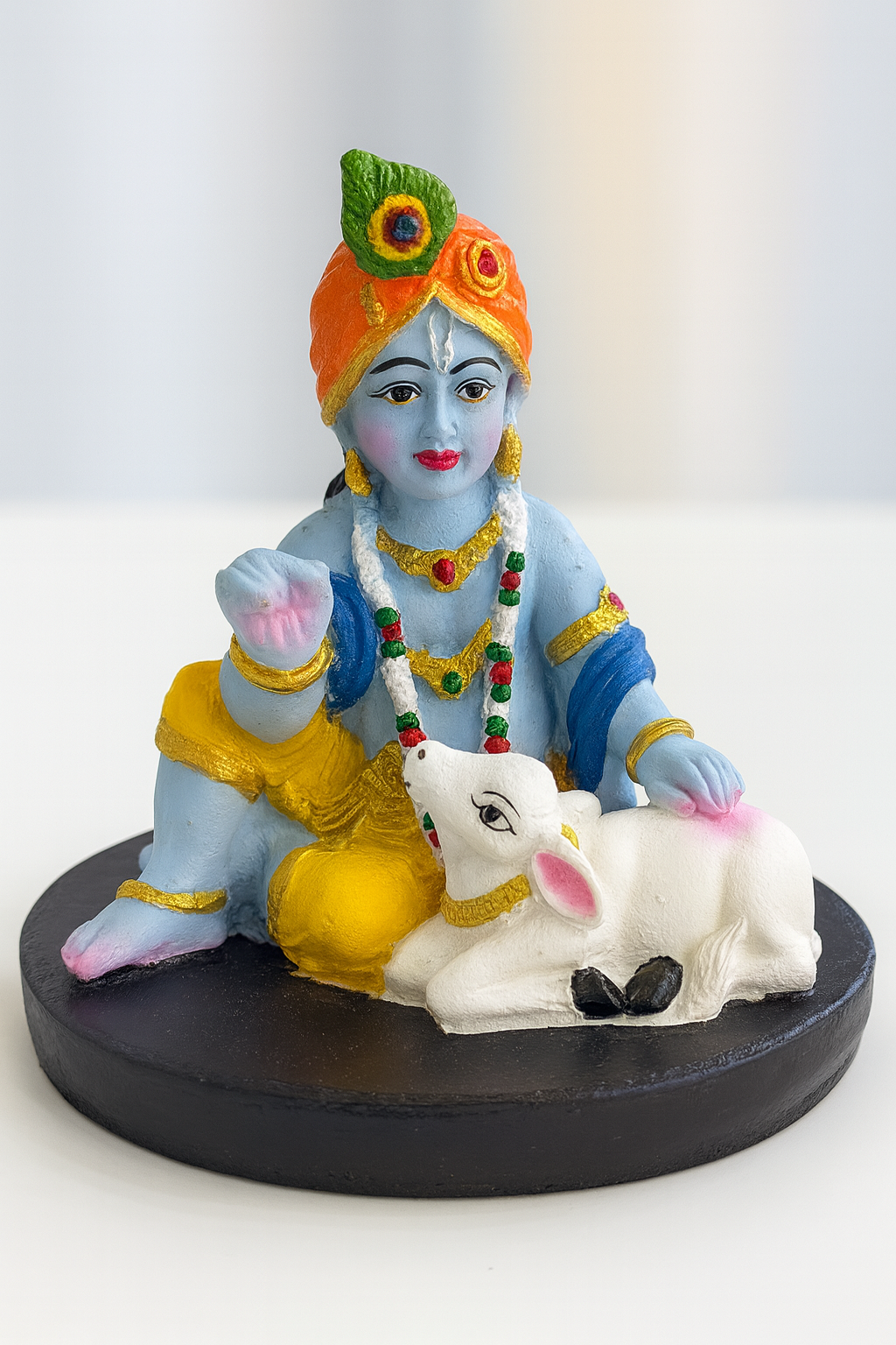 Bring divine charm to your space with this beautifully crafted Baby Krishna with Calf idol. Expertly hand-painted, this statue captures the serene beauty of Krishna in his childhood, adorned with vibrant colors, intricate detailing, and a graceful peacock feather crown.