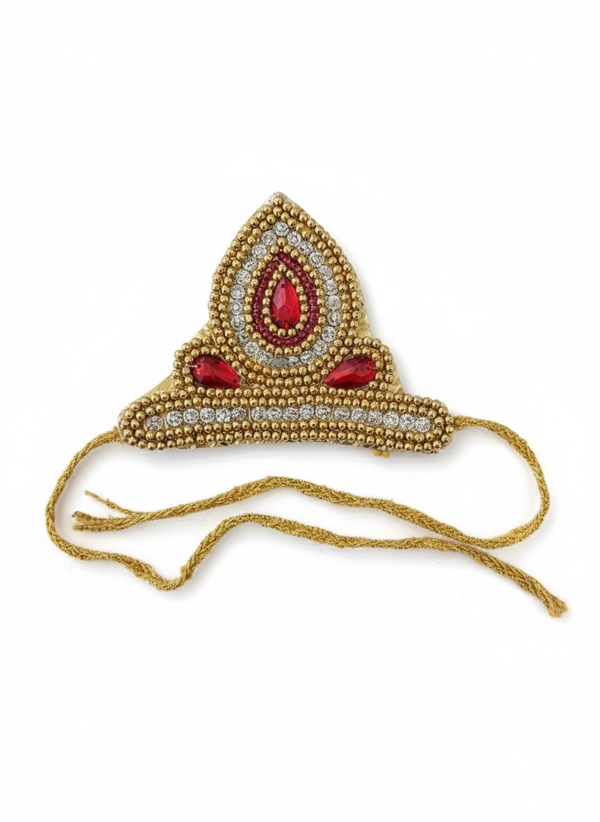 Handcrafted Gold-Beaded Mukut (Deity Crown) — Red Teardrop Gem, Adjustable Ties