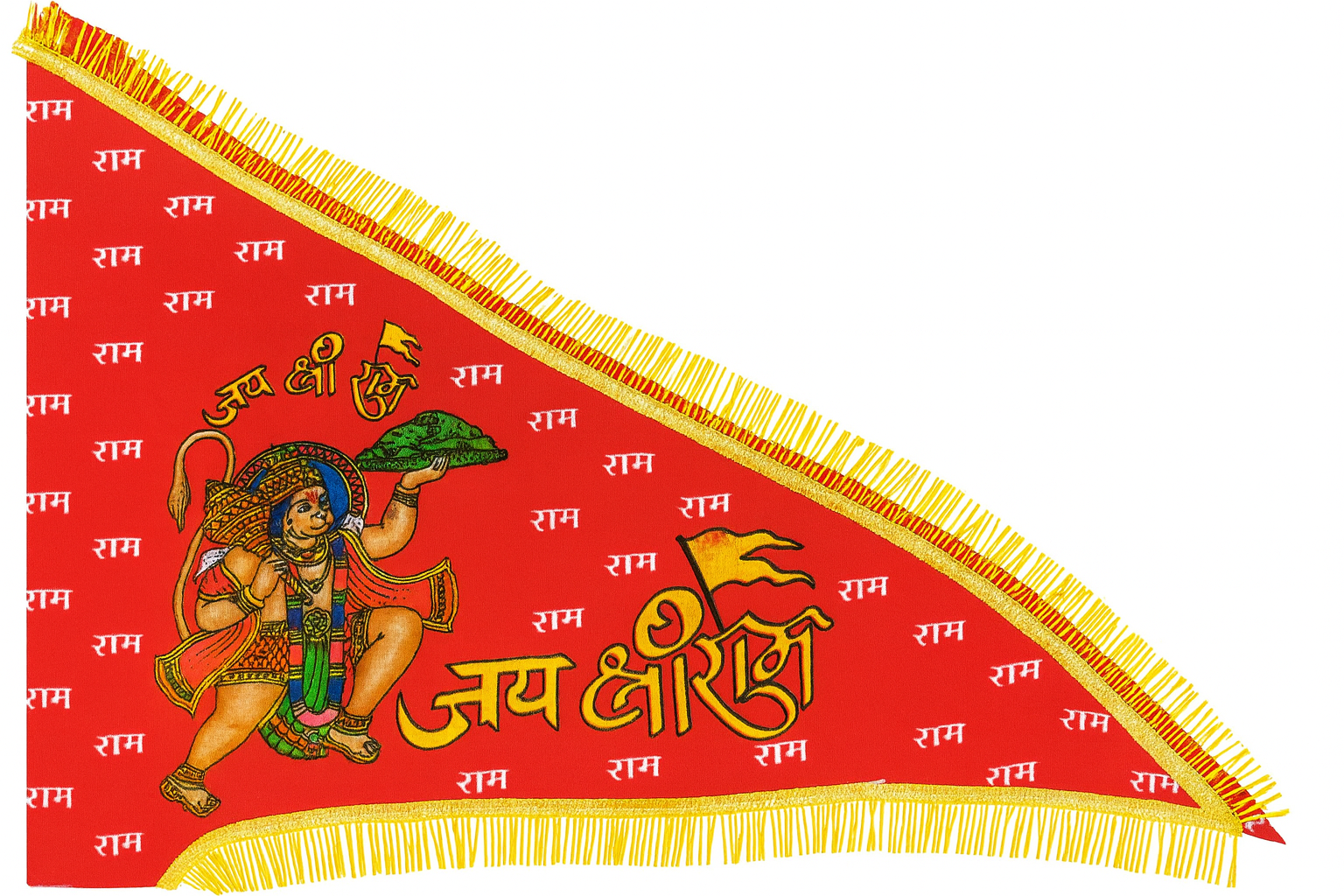 Bring divine blessings, courage, and positivity to your home or temple with this beautifully crafted Hanuman Pataka / Flag/ Jhanda. Featuring the vibrant image of Lord Hanuman carrying the Sanjeevani mountain, this triangular red flag is adorned with the sacred “राम” text and the bold inscription “जय श्री राम” in golden-yellow lettering.