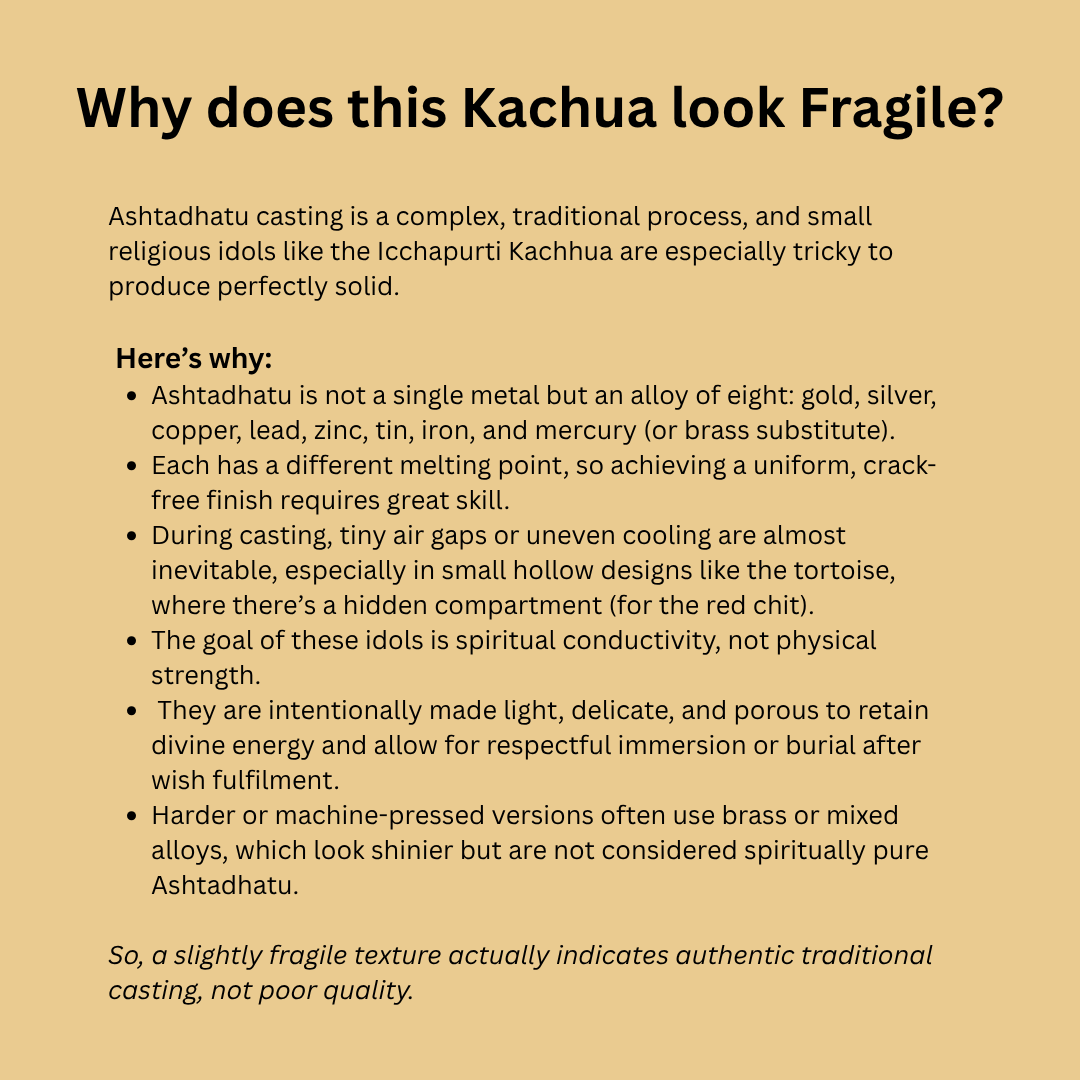 Each Shri Icchapurti Kachhua is handcrafted using traditional casting methods passed down through generations.