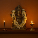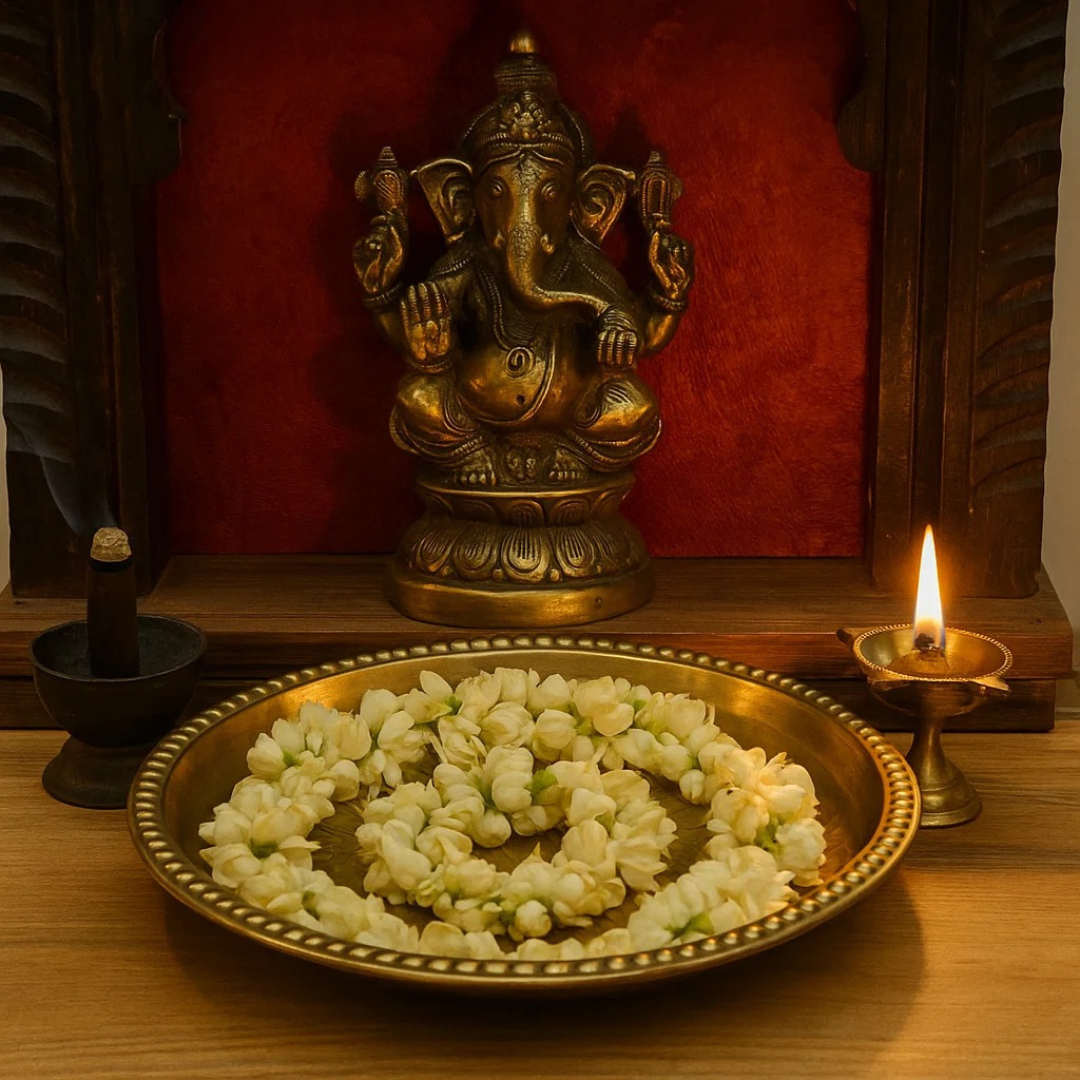 Invite a breath of pure fragrance into your home. This hand-strung jasmine (mogra) garland is lovingly made from freshly picked blooms and measures 30 cm — just-right for offering at the altar, adorning hair for festive moments, or decorating small puja spaces. Each garland carries the gentle, soothing aroma of real mogra flowers and arrives ready to place beside your deity or wear for special occasions.