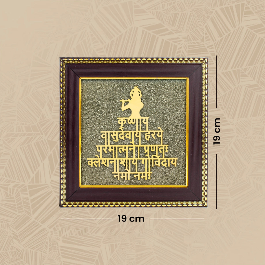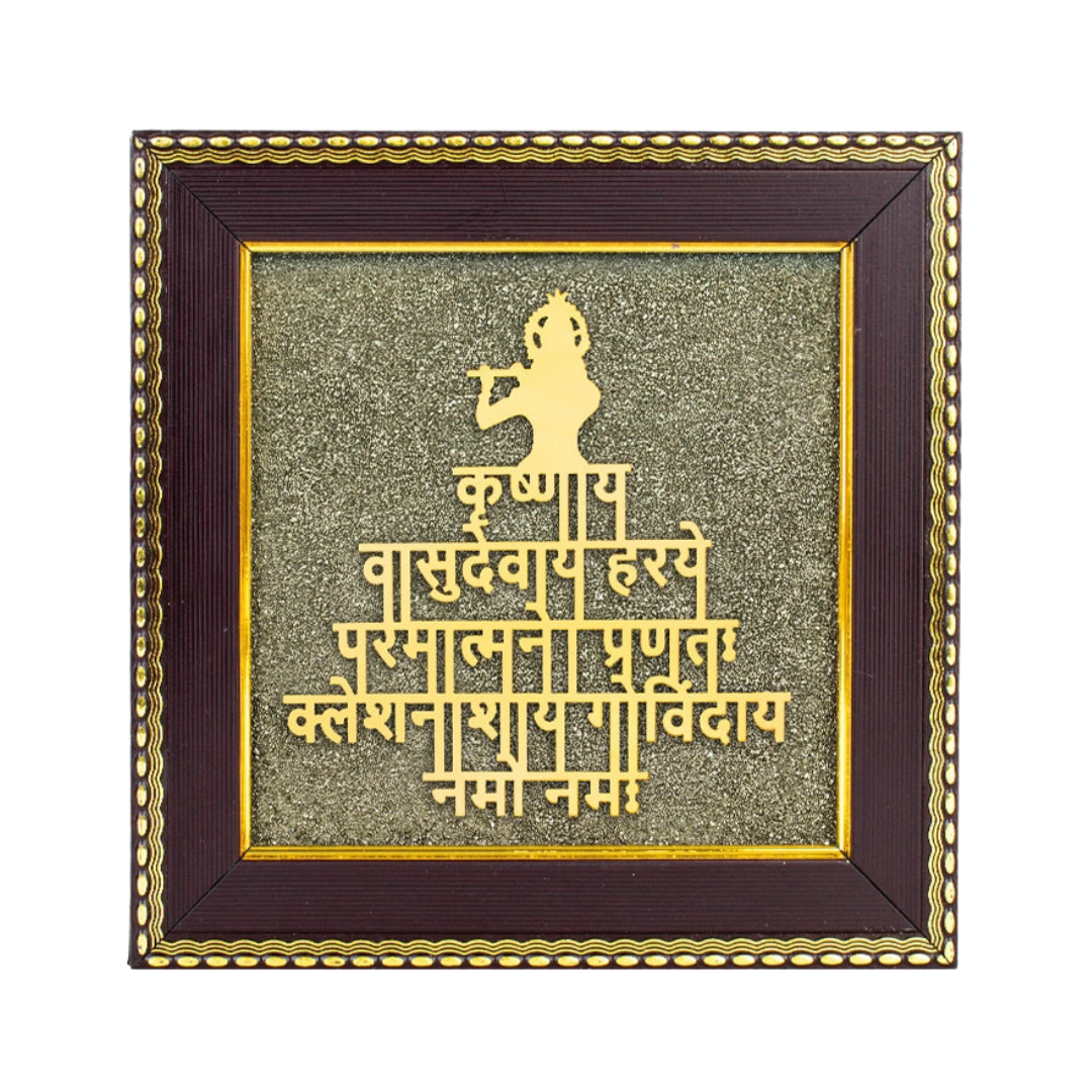 - What it is: Framed plaque with Shree Krishna Maha Mantra printed/embossed over a pyrite background in a decorative frame.