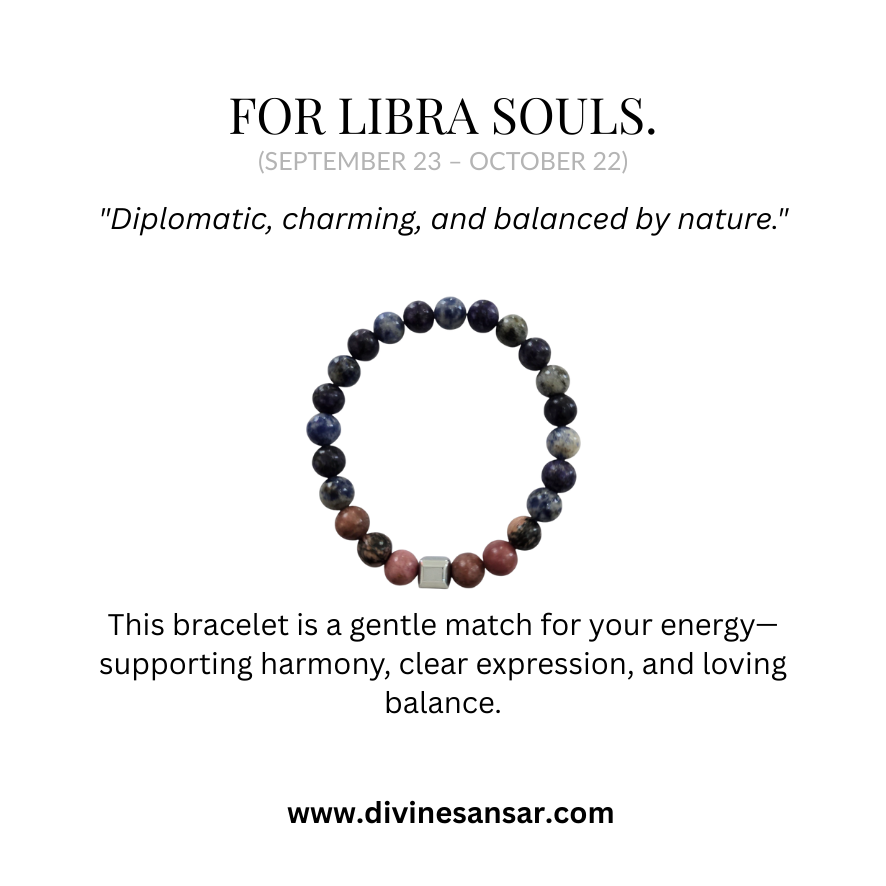 For Libra souls—diplomatic, charming, and balanced by nature. This Libra Crystal Bracelet is curated as a gentle match for your energy, traditionally associated with harmony, clear expression, and heart-led balance.