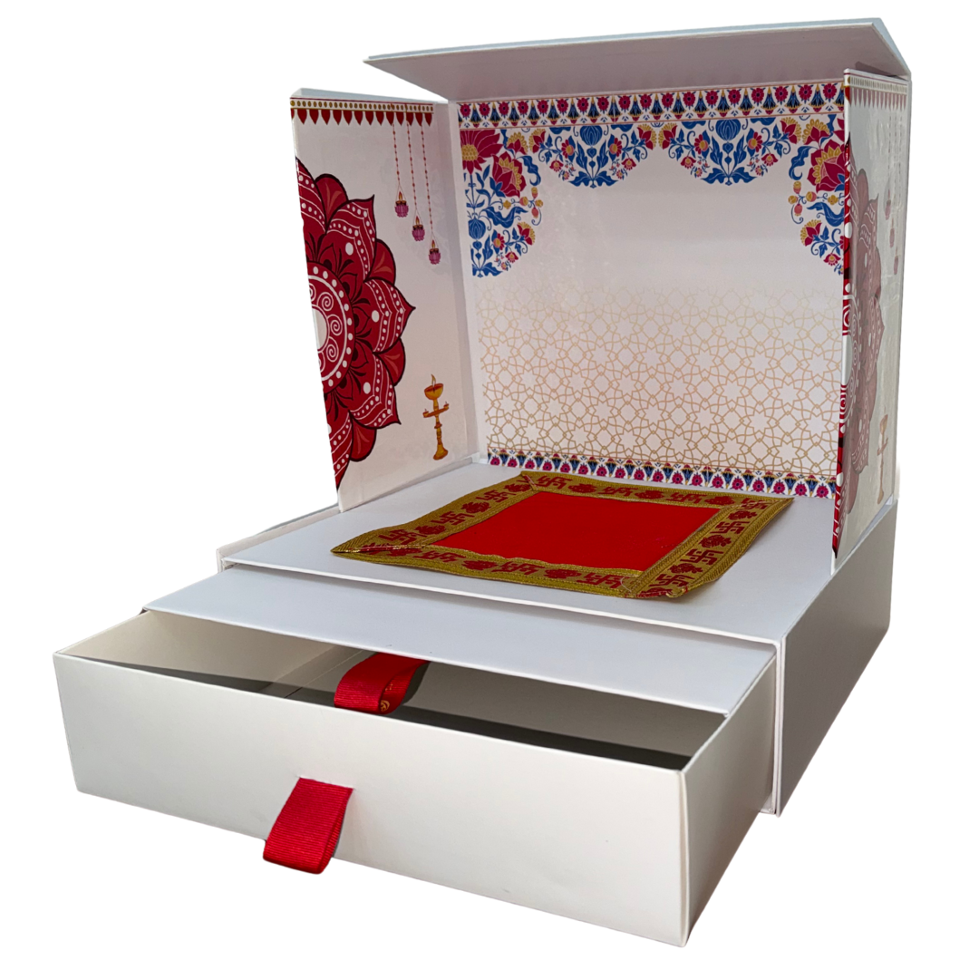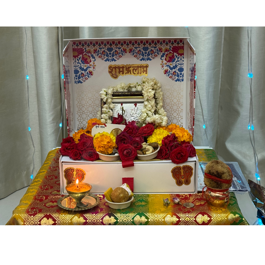 Setup is tool-free — unfold, place your murti (small sizes fit comfortably), open the drawer for kumkum & akshat, and begin your ritual. When finished, close the temple and store it neatly or give it as a ready-to-gift keepsake.
