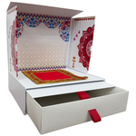 - Hidden pull-out drawer with a ribbon tab for kumkum, haldi, rice (akshat) and small accessories.