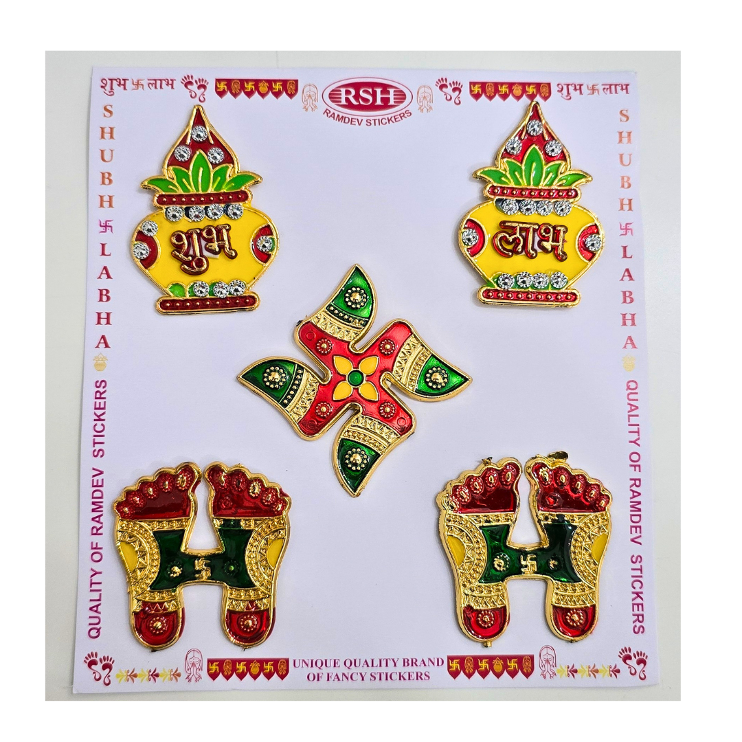 The set features 2 Kalash stickers with “Shubh” and “Labh”, a Swastik, and 2 decorative Pooja Feet. Each piece is beautifully detailed with a golden metallic finish and enamel colors in red, green, yellow, and white. Lightweight and easy to apply using double-sided tape, these auspicious symbols are perfect for pooja rooms, main entrances, mandirs, or festive gifting.