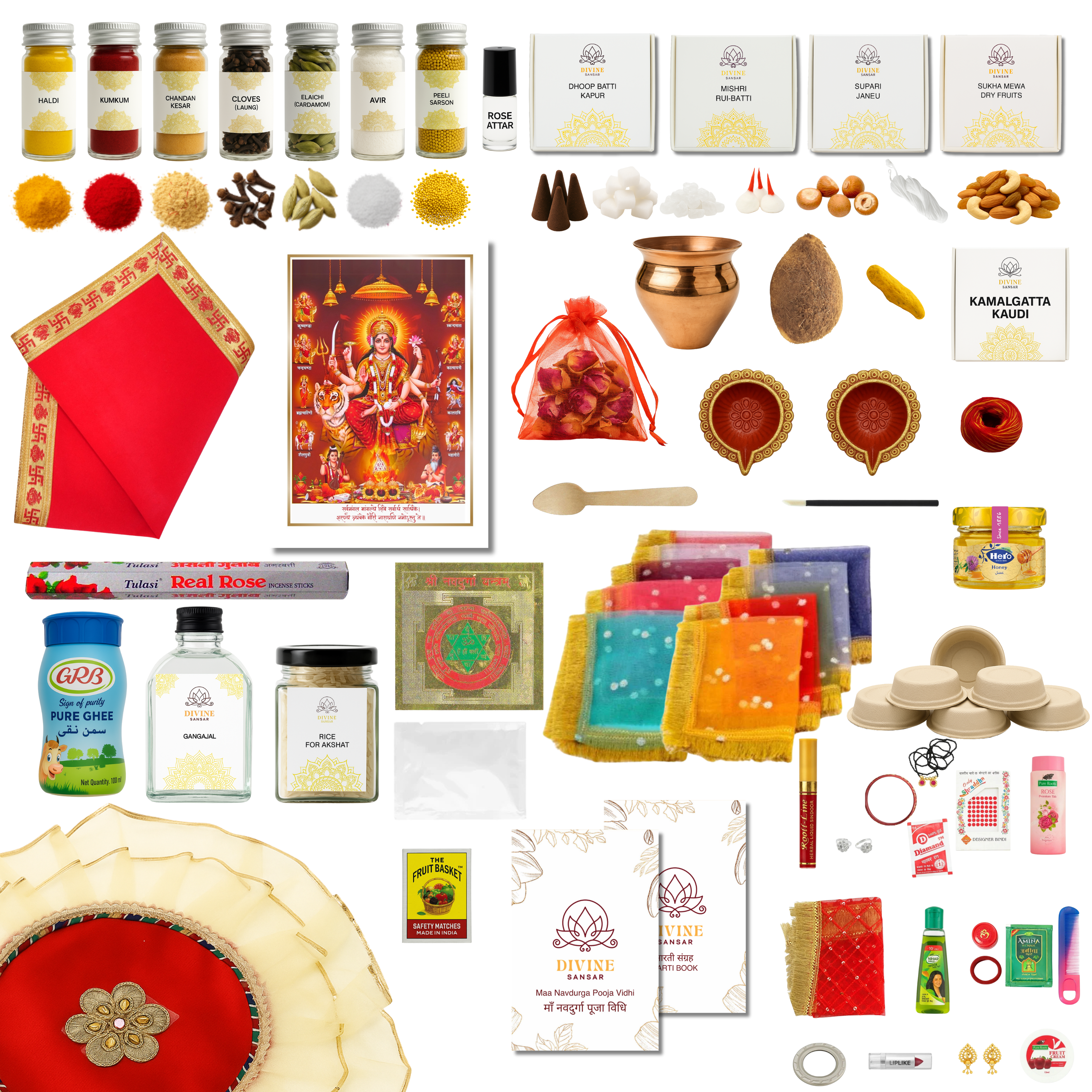 Aarti Book, Aasan Kapda, Agarbatti, Avir, Chandan Kesar, Chawal, Devi Photo Frame, Dhoop, Diya, Durga Chalisa, Elaichi, Gangajal, Ghee, Haldi Powder, Haldi Sabut, Ittar, Jow, Kalash, Kamal Gatta, Kapoor, Kumkum, Laung, Match Box, Mauli, Mishri, Nariyal, Navdurga Yantra, Peeli Sarso, Plastic Plates, Plastic Spoon, Rui Batti, Supari, Kanya Pujan Vidhi (QR Code), Navratri Pujan Vidhi