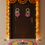 The combination of vibrant pink lotus, golden detailing, and colorful enamel peacock feathers brings festive radiance to your pooja space, temple door, or home entrance. The auspicious Shubh and Labh plaques complete the set, inviting good fortune and positivity.