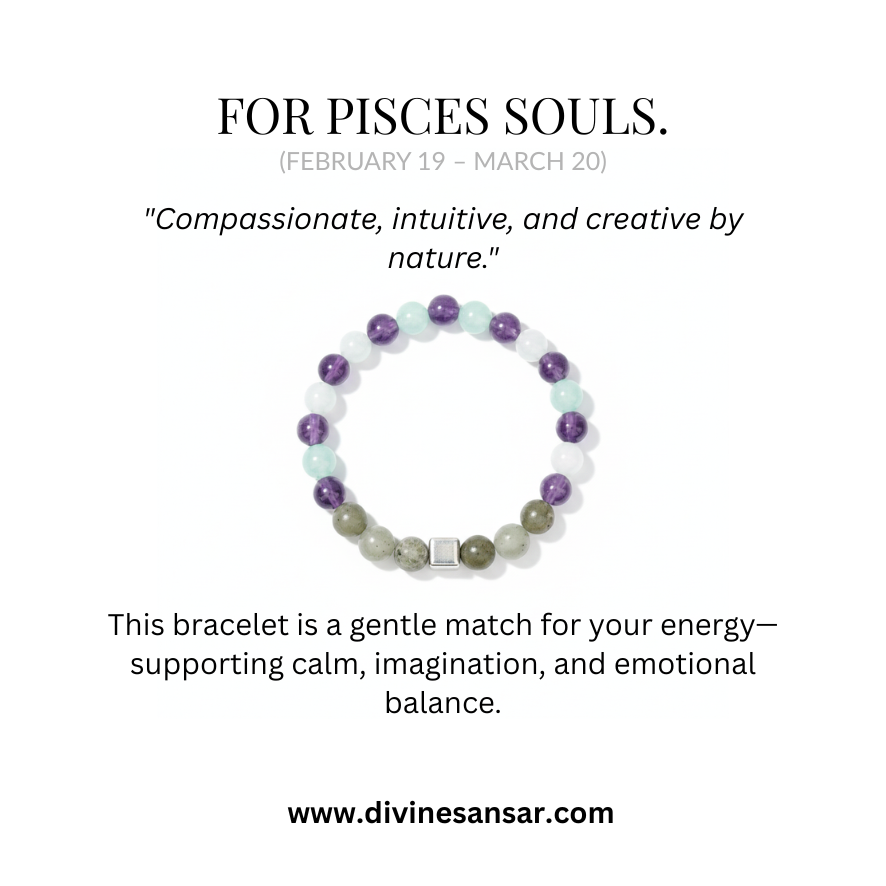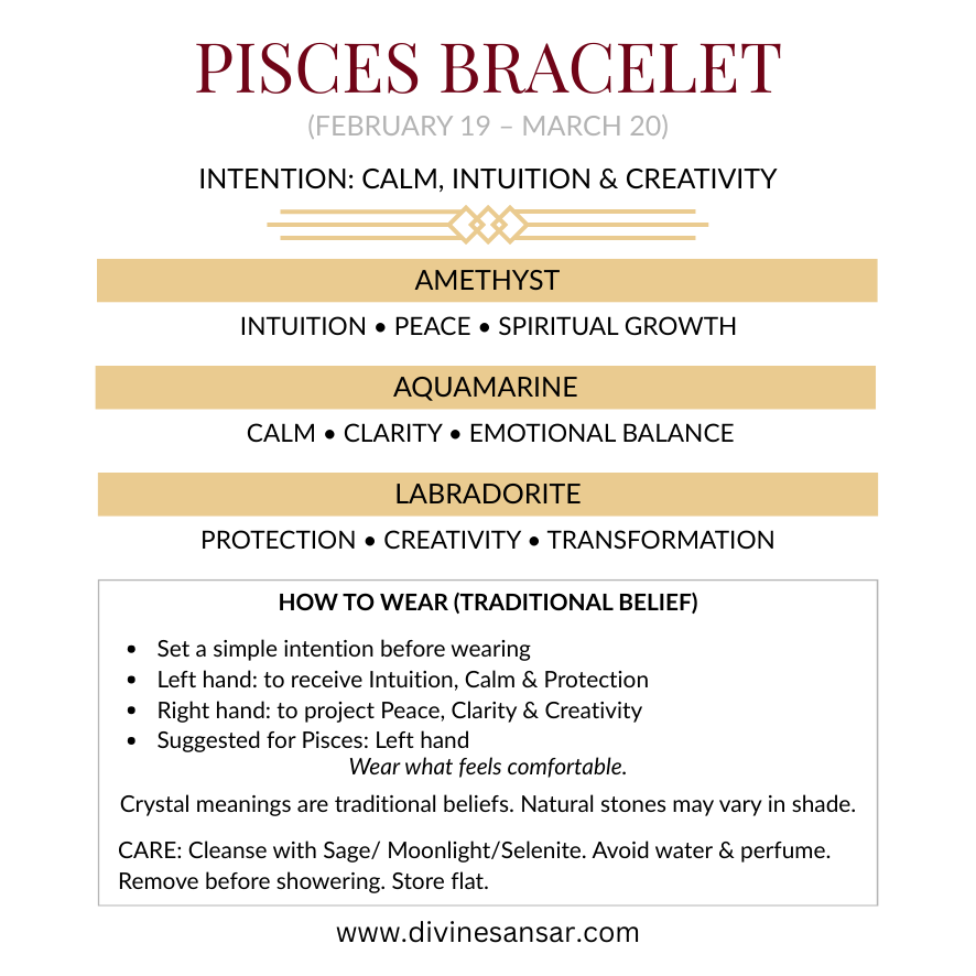 For Pisces souls—compassionate, intuitive, and creative by nature. This Pisces Crystal Bracelet is curated as a gentle match for your heart, traditionally associated with calm, clarity, and imagination.