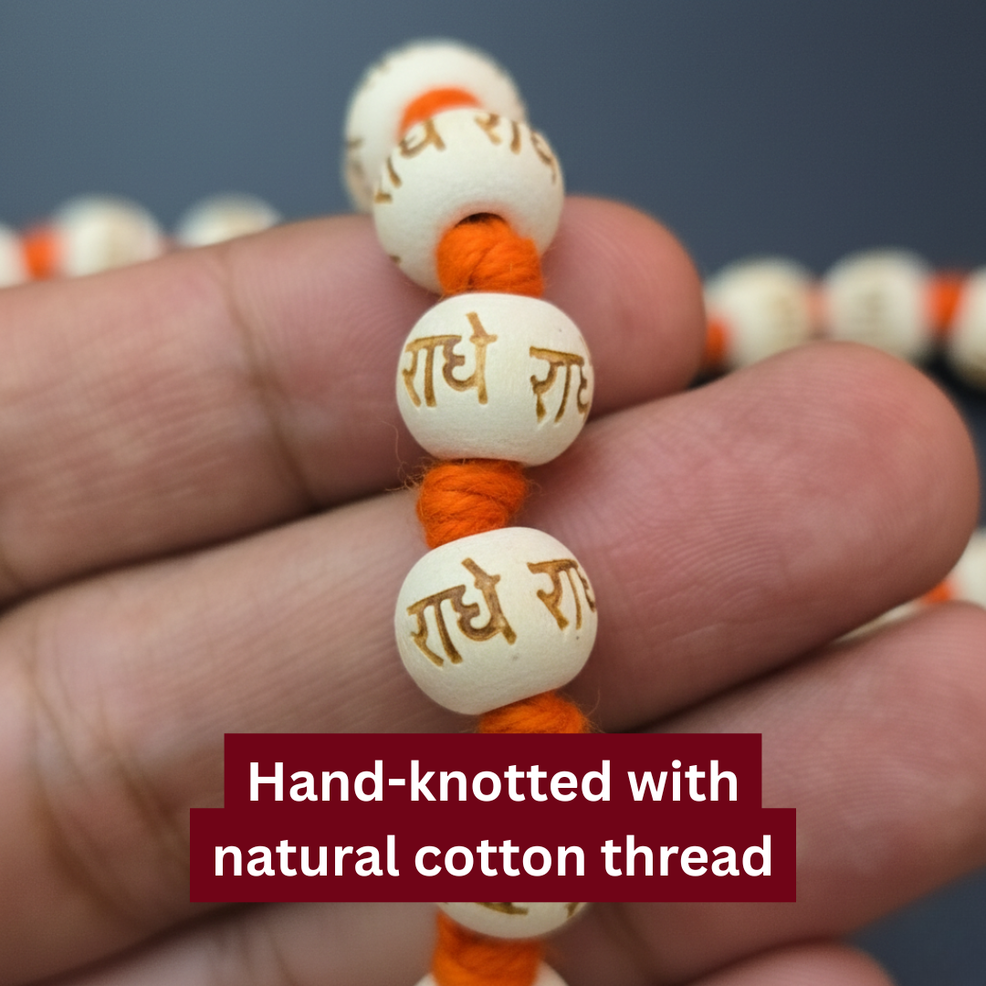 A sacred companion for your daily practice — our Radhe-Engraved Tulsi Jaap Mala blends traditional devotion with simple, durable craftsmanship. Each bead is carved from natural Tulsi (holy basil) wood, hand-knotted on pure cotton thread and finished with a soft cotton tassel. The beads are engraved with “Radhe” to keep your focus anchored in devotion as you chant, meditate or offer prayers.