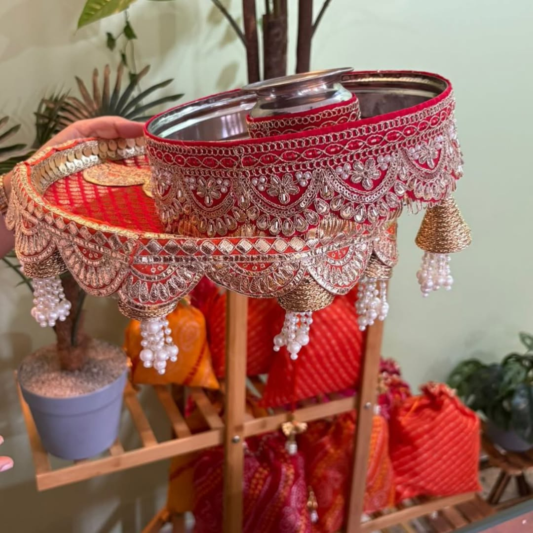 Celebrate Karwa Chauth with unmatched elegance using our Royal Designer Thali Set. Each piece is a blend of tradition and luxury, handcrafted with shimmering zari embroidery, sparkling stones, pearl hangings, and intricate detailing that make it truly one-of-a-kind.