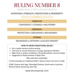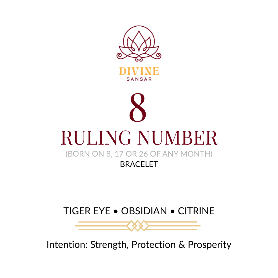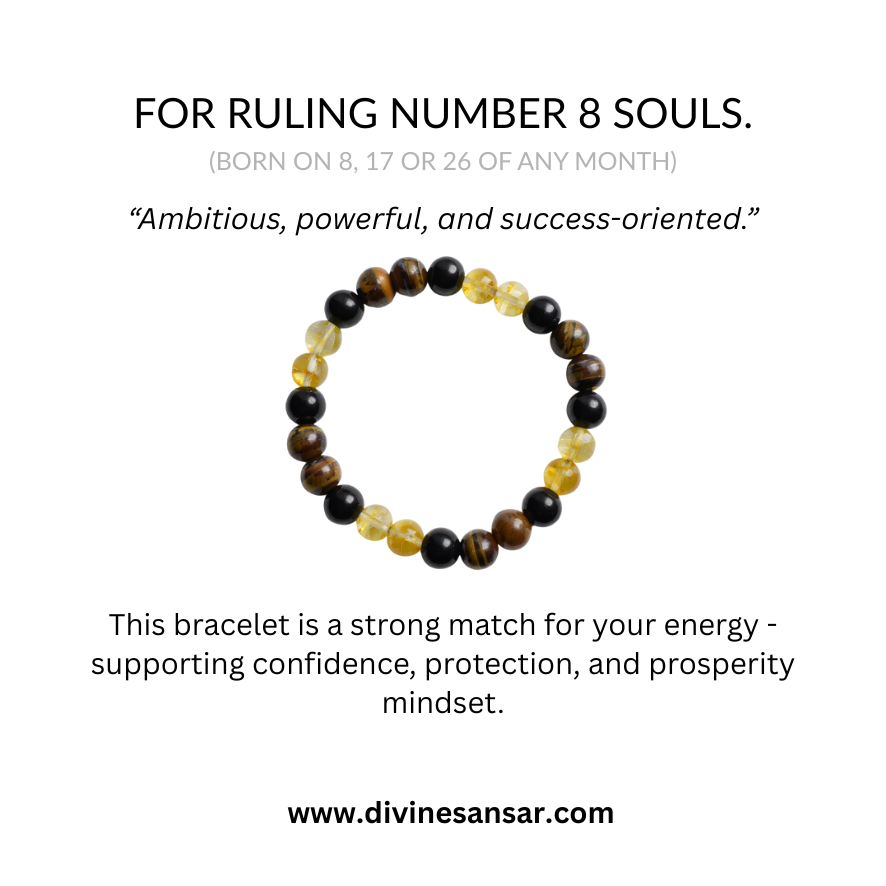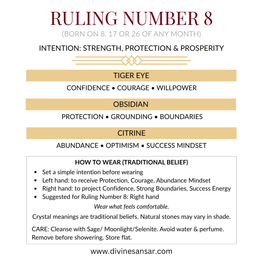 Number 8 energy is about leadership, responsibility, and material mastery. This bracelet is curated for courage, protection, and prosperity mindset (traditional belief).