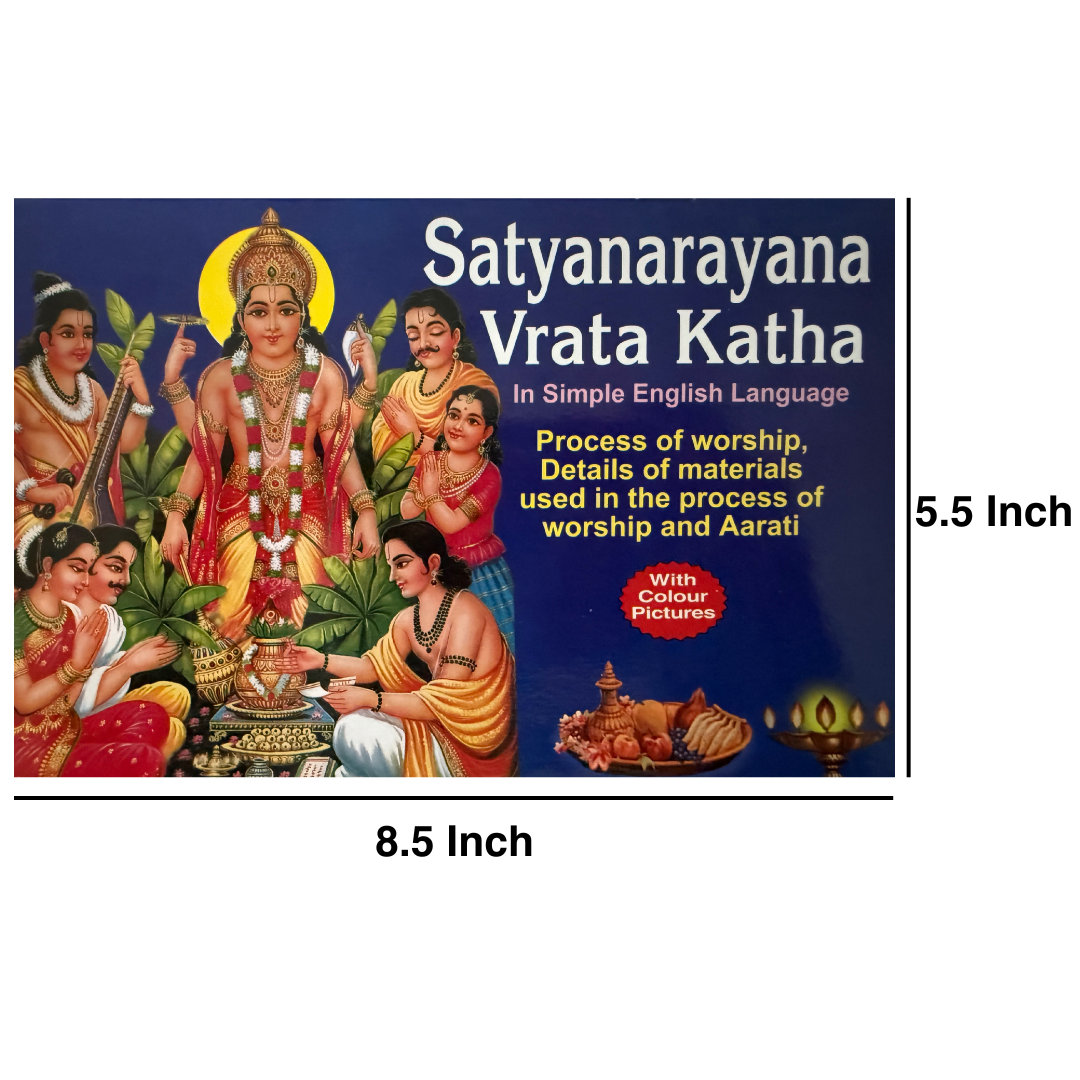 - Contents: Satyanarayan Vrat Katha (English), stepwise pūjan vidhi, complete samagri checklist, and full aarti.