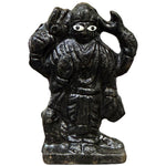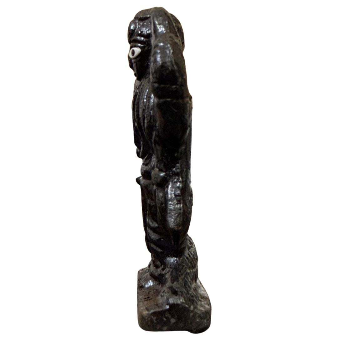 Mini Shanidev statue — 7.5×5.5 cm, temple-black finish with white eye inlays. Compact puja idol perfect for altars, car shrines, desks and devotional gifting.