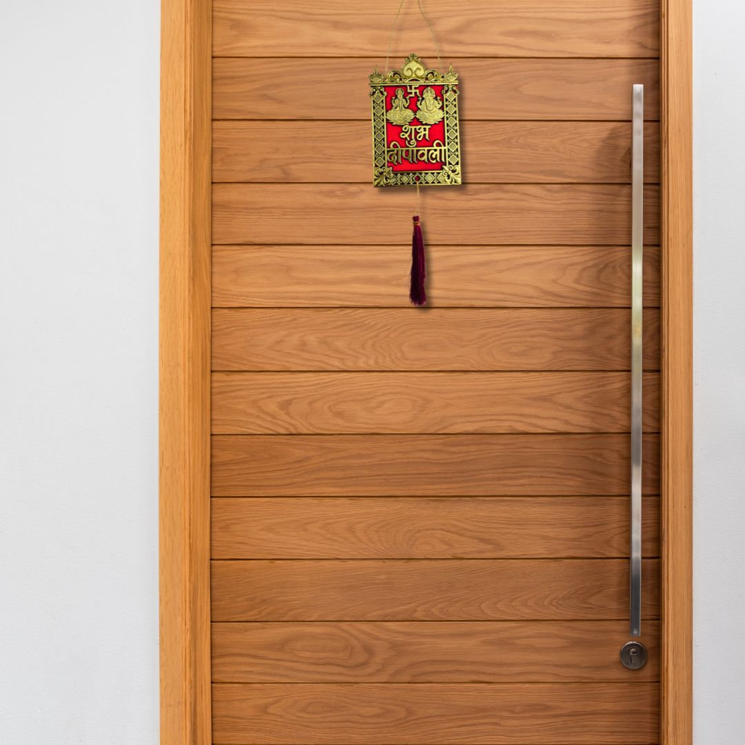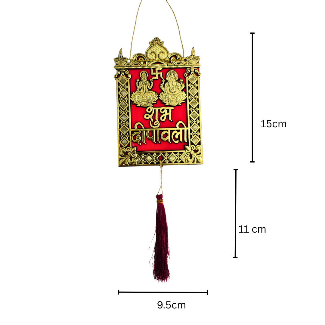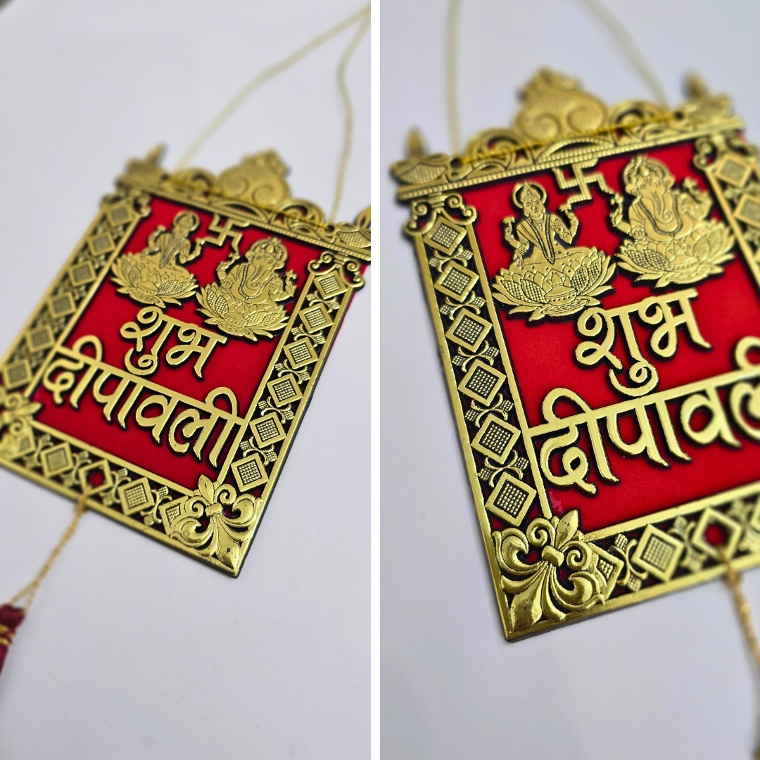 The piece features the sacred Swastik symbol and the Hindi text “शुभ दीपावली” in ornate golden acrylic, highlighted by a luxurious red tassel that adds a graceful finishing touch. Perfect for adorning your main door, pooja room, living area, shops, or offices, this décor instantly creates a warm, divine, and festive ambiance.