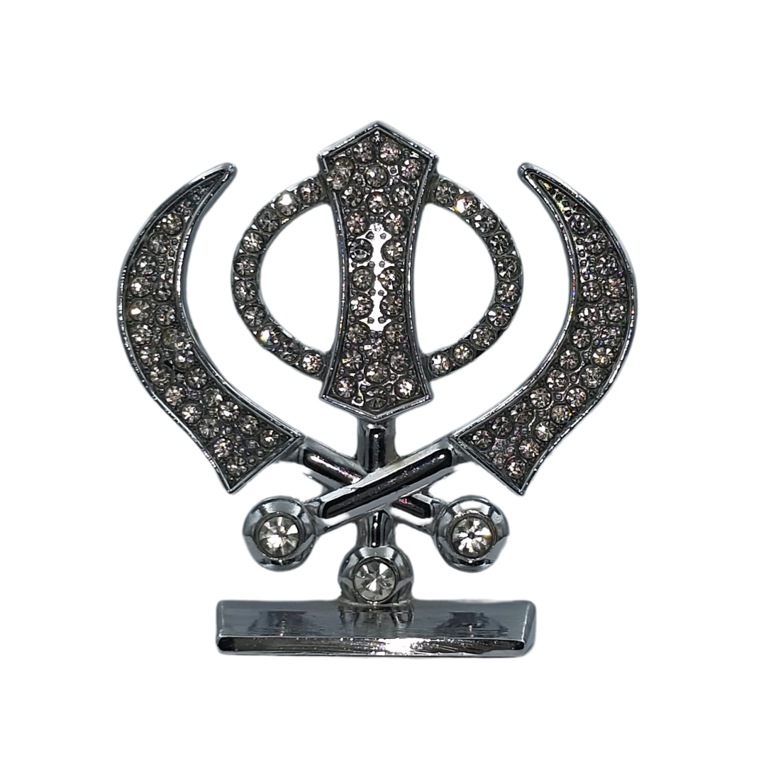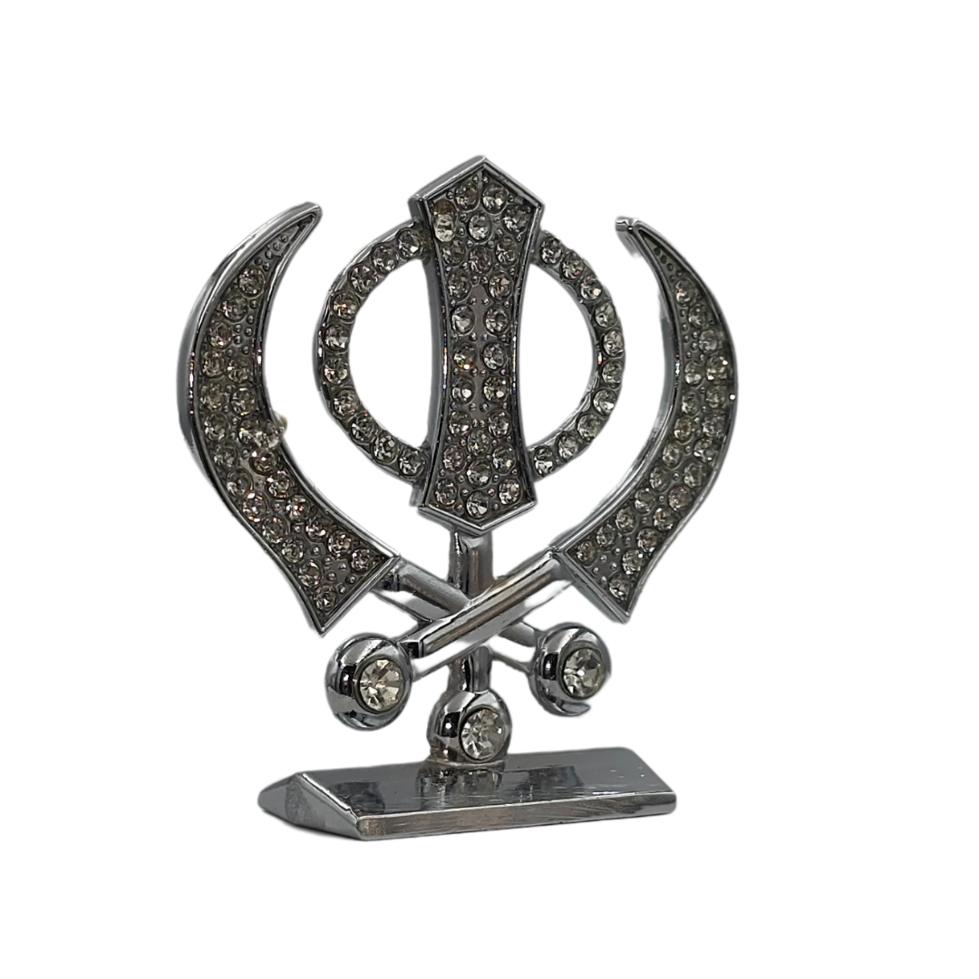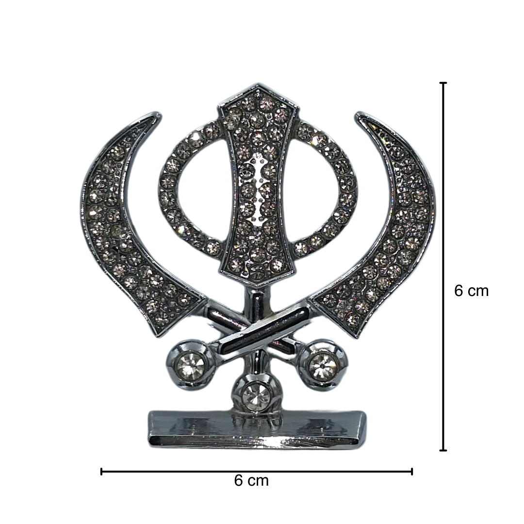 Honor your faith, strength, and Sikh heritage with this Silver Khanda Sahib Idol, a beautifully crafted 6cm x 6cm symbol of divine power, courage, and righteousness. Adorned with sparkling stones, this elegant metallic silver Khanda Sahib is ideal for car dashboards, home temples, and office desks, serving as a constant reminder of spiritual devotion and protection.