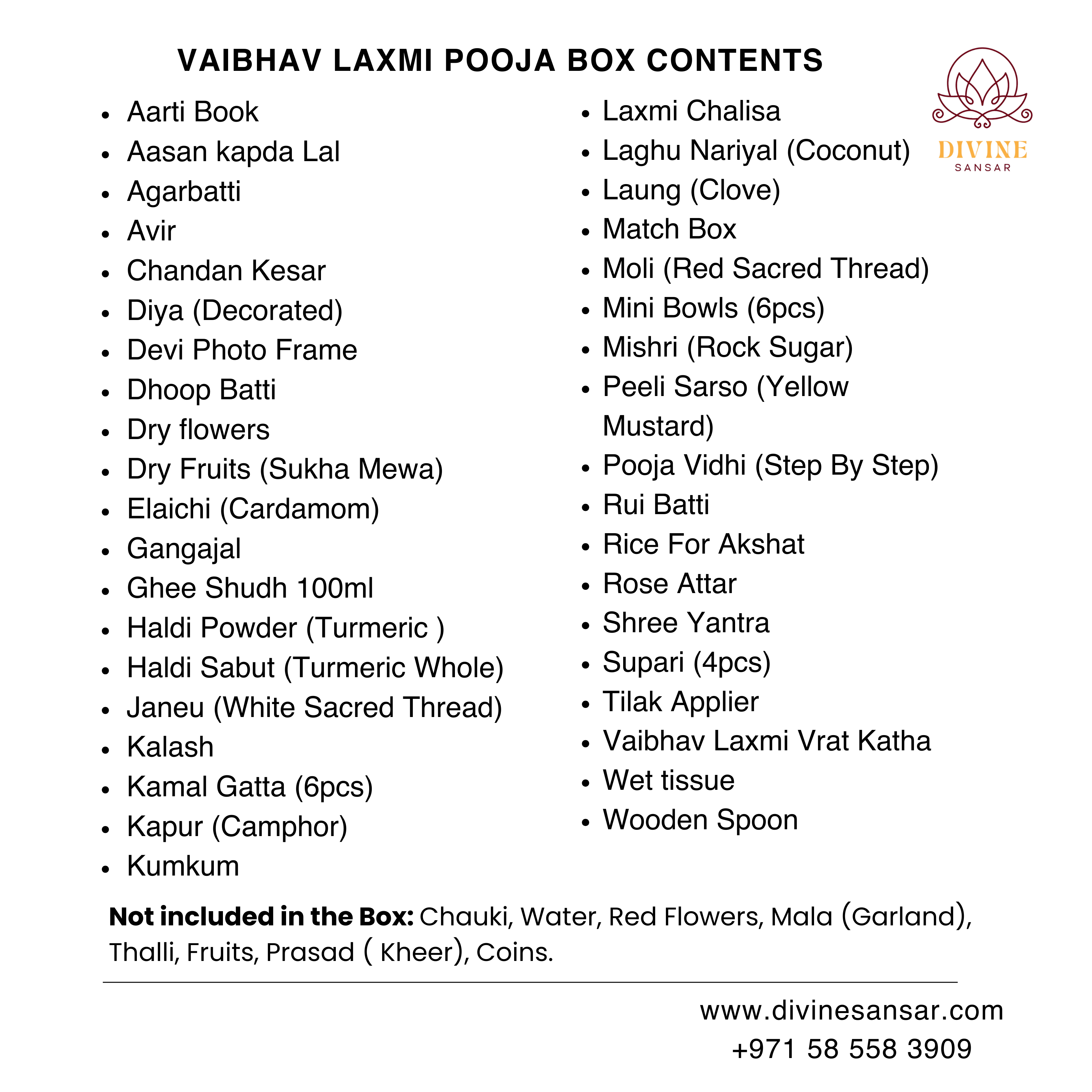The Vaibhav Laxmi Pooja is believed to invite prosperity, abundance, peace, and financial stability into your home. Performing this pooja with the right samagri enhances your intention, strengthens your devotion, and helps create a sacred environment where blessings flow effortlessly. This box ensures you don’t miss any essential item, allowing you to perform the ritual with purity and confidence.