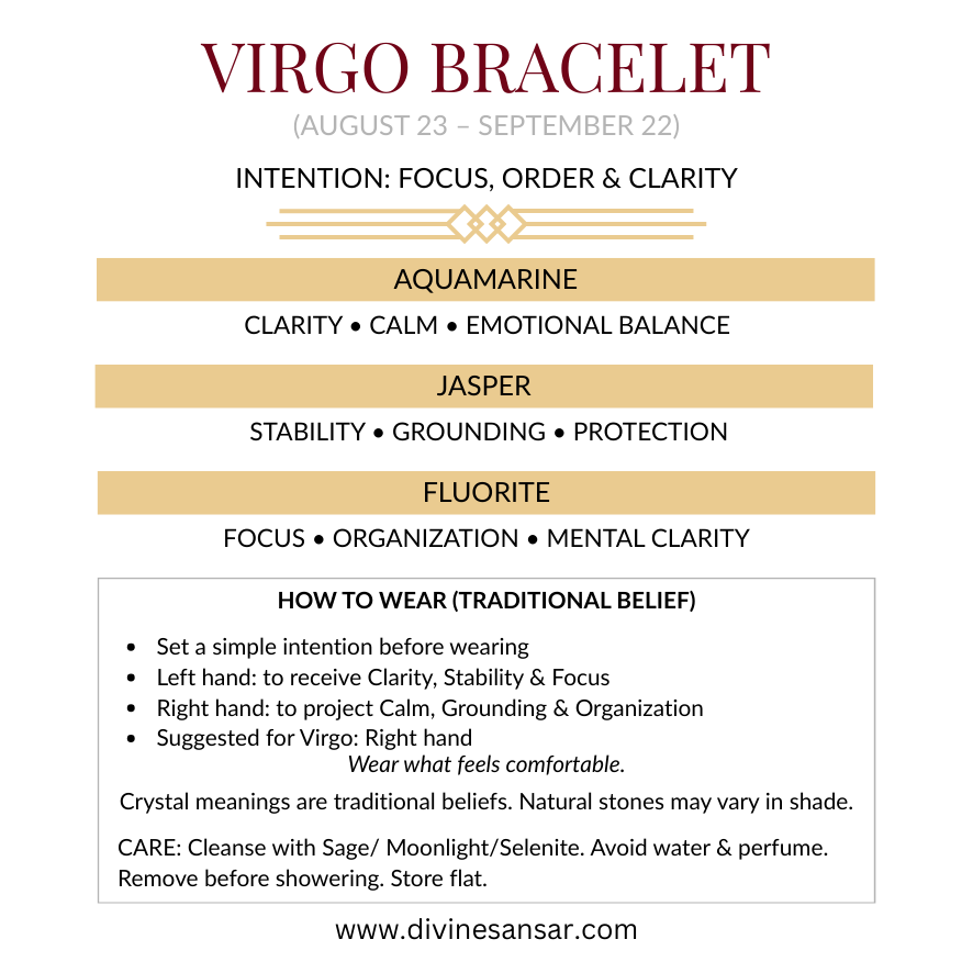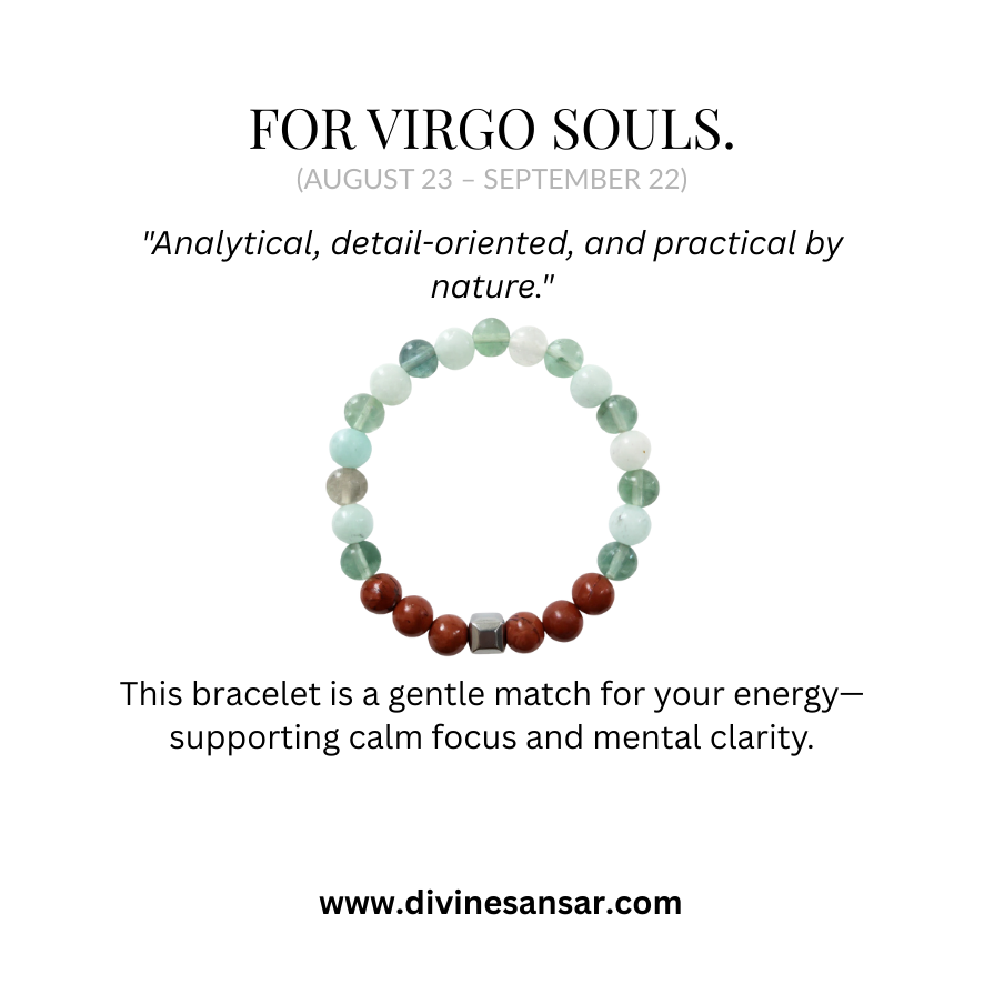 For Virgo souls—analytical, detail-oriented, and practical by nature. This Virgo Crystal Bracelet is curated to support calm focus and clear thinking, with stones traditionally associated with clarity, grounding, and organization.