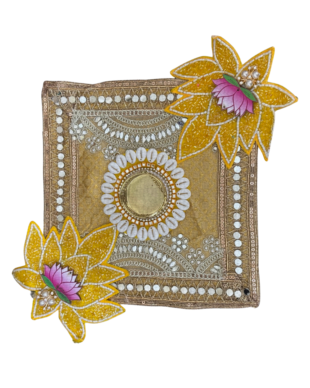 Brighten your pooja corner with a dash of handcrafted charm. This Hand-Embellished Lotus Diya Holder is a decorative square mat that pairs traditional motifs with petite, detailed craftsmanship. The golden embroidered base is studded with tiny mirrors and sequins, while a neat ring of cowrie-style beads frames the central brass tealight plate. Two sun-yellow lotus appliqués — finished with delicate beadwork, faux pearls and a pink lotus motif — sit like twin blossoms at the corners and give the piece a joyful, festive presence.